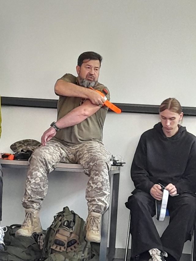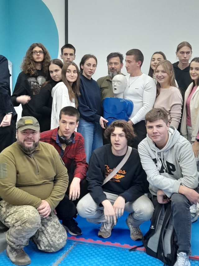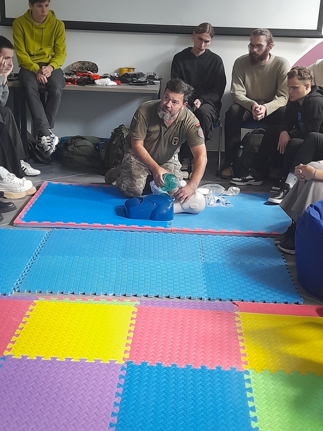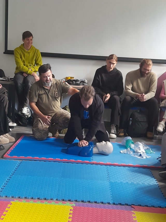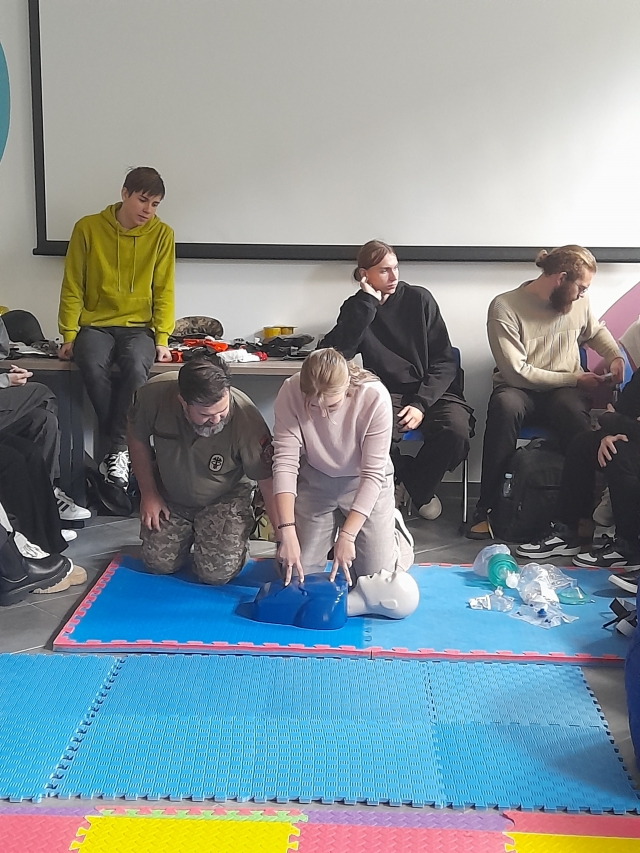 Надзвичайно активізувались студенти, коли вчились зупиняти кровотечу методом накладання джгута (турнікету), тампонади та створювати джгути з підручних матеріалів, проводити серцево-легеневу реанімацію, - оцінювати свідомість постраждалого та звільняти дихальні шляхи, здійснювати зовнішній масаж серця, проводити огляд постраждалого та викликати швидку.
