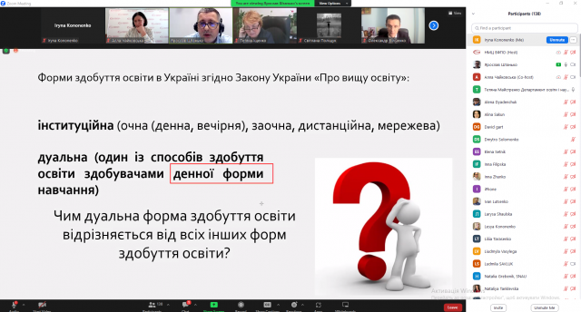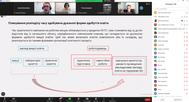 Під час проведення зустрічі було обговорено особливості дуальної форми здобуття освіти за даною формою. Для поглиблення розуміння та нюансів організації навчання здобувачів за дуальною формою освіти спікер вебінару, Ярослав Штанько, сконцентрував увагу учасників на функції учасників дуальної форми здобуття освіти та на найбільш актуальних проблемах, з якими стикаються заклади вищої освіти при її реалізації.