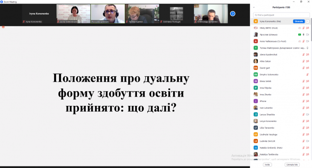 30 червня за сприяння науково-методичного центру вищої та фахової вищої освіти було проведено вебінар «Положення про дуальну освіту прийнято: що робити?». Учасником даного заходу були і представники факультету тваринництва та водних біоресурсів, доцент кафедри аквакультури Ірина Кононенко.