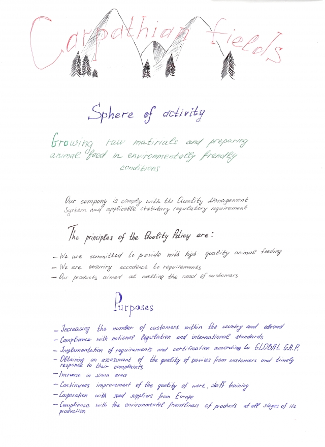 Розроблені політики в сфері якості містять основні напрямки та наміри організації щодо якості і відображають пріоритети і принципи в розвитку підприємства для поліпшення якості продукції та послуг, підвищення задоволеності споживачів, вдосконалення елементів системи управління з урахуванням вимог різних зацікавлених сторін (працівників, постачальників, підрядників, партнерів, суспільства в цілому ). Отримані цілі у сфері якості розроблені відповідно до принципу SMARTі є: Specifiс– конкретні, Measurable — вимірювані, Achievable — досяжні, Realistic– реалістичні та Time-based— визначені у часі.