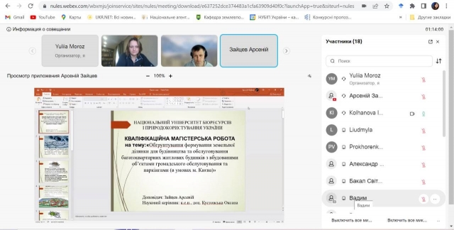 Теми магістерських робіт дуже актуальні та цікаві, зокрема: Здобувачі денної форми навчання: Богомаз Михайло Федорович «Еколого-економічні засади формування сільськогосподарського землекористування із тваринницькими комплексами (на прикладі СП ТОВ «Нива Переяславщини»)», Бондаренко Андрій Константинович «Оцінка екологічних наслідків інтенсифікації сільськогосподарського землекористування в ринкових умовах», Голенко Олена Андріївна «Удосконалення науково-методичних засад консолідації земель сільськогосподарських підприємств (на прикладі ТОВ «Агро-С» в межах Бориспільського району Київської області)», Гузь Віталіна Віталіївна «Удосконалення науково-методичних засад розроблення робочих проектів землеустрою щодо рекультивації порушених земель (на прикладі АТ «Покровський гірничозбагачувальний комбінат»)», Денисюк Анна Віталіївна «Науково-методичні засади планування використання та охорони земель сільської громади», Зайцев Арсеній Юрійович «Методичні засади формування відомостей про об’єкти нерухомого майна для відображення в Єдиній державній електронній системі в галузі будівництва», Новаковський Дмитро Леонідович «Удосконалення науково-методичних засад інвентаризації міських земель в умовах історичного ареалу (на прикладі міста Києва)», Прохоренко Владислава Володимирівна «Формування землекористування об’єктів альтернативної енергетики (на прикладі вітрової електростанції)», Супрун Олександр Сергійович «Землевпорядне забезпечення екологізації сільськогосподарського землекористування в умовах розвинених ринкових земельних відносин», Таращенко В’ячеслав Євгенович «Науково-методичні засади формування та інвентаризації масивів земель сільськогосподарського призначення (в умовах Київської області)».