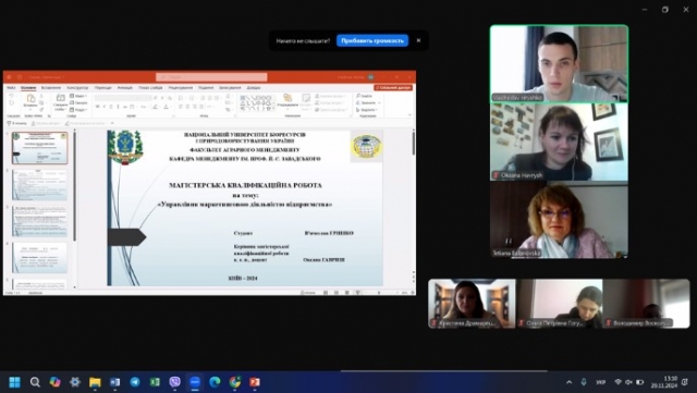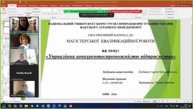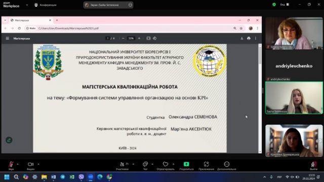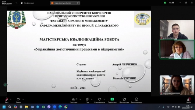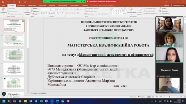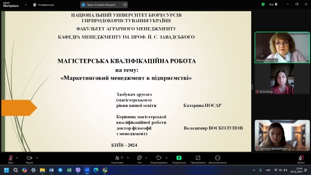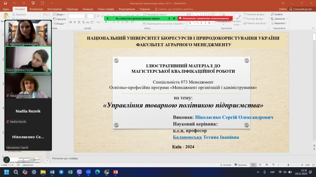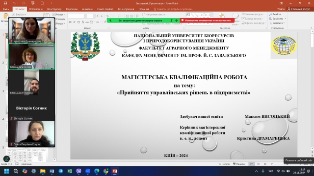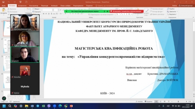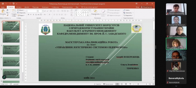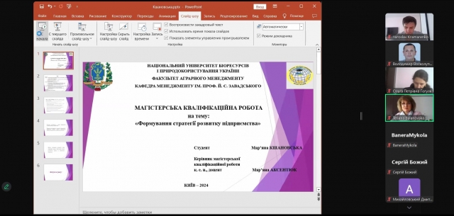 Науково-педагогічні працівники кафедри розглянули та оцінили актуальність, мету, результати та практичну спрямованість досліджень, ознайомились із пропозиціями за темами виконаних здобувачами вищої освіти магістерських кваліфікаційних робіт, висловили зауваження та побажання, які варто врахувати у процесі підготовки до захисту наукових робіт на засіданні Екзаменаційної комісії. Підводячи підсумки обговорення заслуханих доповідей і поданих до них презентацій, за результатами проведених досліджень, науково-педагогічні працівники кафедри менеджменту ім. проф. Й. С. Завадського прийняли рішення рекомендувати до захисту магістерські кваліфікаційні роботи здобувачів другого (магістерського) рівня вищої освіти спеціальності 073 «Менеджмент» освітньо-професійної програми «Менеджмент організацій і адміністрування» денної форми навчання із врахуванням зроблених зауважень і наданих рекомендацій. Згідно норм Положення про підготовку і захист магістерської кваліфікаційної роботи в НУБіП України та Вимог до атестації здобувачів ОС «Магістр» та попереднього захисту магістерських кваліфікаційних робіт (від 02.09.2024 р.) також відбулась атестація здобувачів другого (магістерського) рівня вищої освіти спеціальності 073 «Менеджмент» освітньо-професійної програми «Менеджмент організацій і адміністрування» денної форми 1 р. н. Здобувачі обґрунтували актуальність обраних проблематик майбутніх магістерських кваліфікаційних робіт, презентували мету, завдання та методи досліджень. Науково-педагогічні працівники кафедри менеджменту ім. проф. Й. С. Завадського дійшли висновку, атестувати здобувачів другого (магістерського) рівня вищої освіти спеціальності 073 «Менеджмент» освітньо-професійної програми «Менеджмент організацій і адміністрування» денної форми навчання 1 р. н. за результатами виконання відповідних завдань індивідуальних планів.
