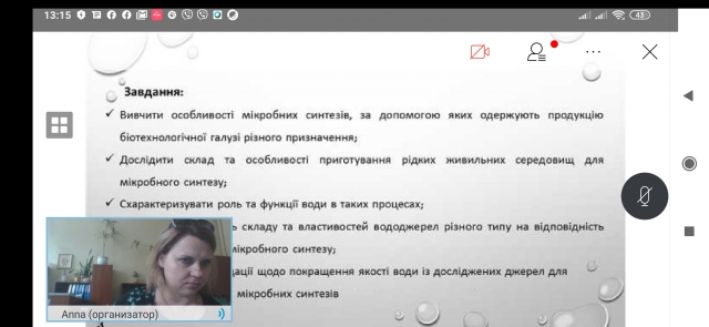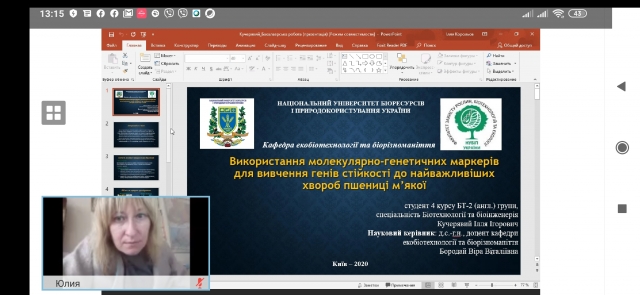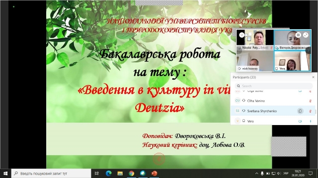 28 травня на кафедрі екобіотехнології та біорізноманіття було проведено розширене он-лайн засідання, на якому відбувся попередній захист випускних бакалаврських робіт студентів денної форм навчання спеціальності «Біотехнології та біоінженерія».