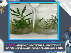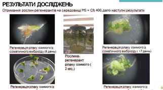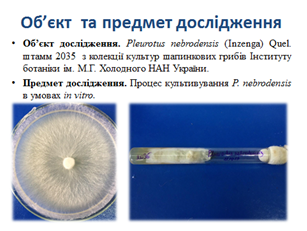 Окремим напрямком йшли дослідження з особливостей культивування рослин в умовах in vitro, проведені Вікторією Двороківською, Єлизаветою Бережною, Андрієм Романенко, Юлією Бученко та іншими студентами під керівництвом Оксани Лобової, Юлії Коломієць, Віри Бородай). Особливо хочеться відмітити групу студентів Світлану Ширченко, Анастасію Савенко, Дениса Зленко та інших, які під керівництвом доцента Ольги Бойко вивчали особливості росту видів базидіальних грибів роду Pleurotus та інших грибів, а також Дар’ї Метейко, що досліджувала особливості культивування штаму-продуценту вітаміну В2 (рибофлавіну) Bacillus subtilis на базі Інституту харчової біотехнології та геноміки.