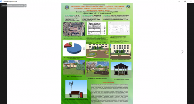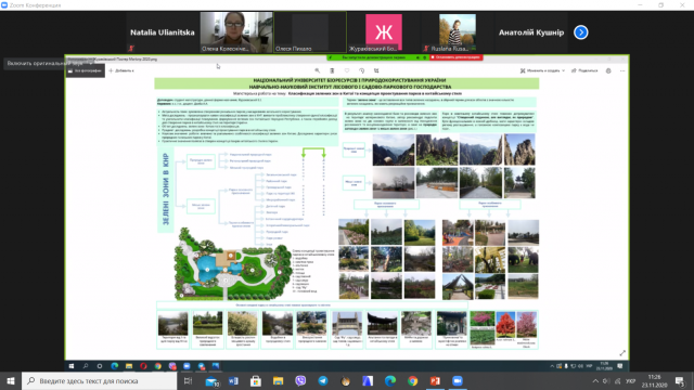 Постерна онлайн-презентація магістрів спеціальності «Садово-паркове господарство» вигідно вирізняється яскравістю постерів, креативністю, унаочненістю та авторськими проектними пропозиціями. Магістри достойно представили свої проекти та роботи, зробили змістовні доповіді, дали відповіді на питання та вислухали конструктивні побажання викладачів кафедри ландшафтної архітектури та фітодизайну. Цьогорічні теми, як завжди, були досить різноманітними та стосувалися питань: реконструкції об’єктів, оцінки стану та рівня озеленення населених пунктів, проектування нових об’єктів, садів на штучних основах та озеленення інтер’єрів. Цікавістю та насиченістю питань стосувалися роботи: Жураківського Богдана (тема роботи: класифікація зелених зон в Китаї та концепція проектування парків в китайському стилі) та Русанюк Руслани (тема роботи: раритетна екзотична дендрофлора штучних заповідних парків Закарпатської області).