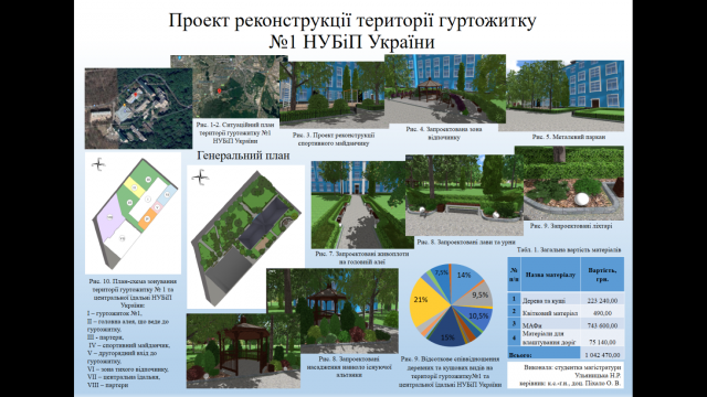 Цікаву дискусію та жваве обговорення викликали роботи Рибалко Антона та Ульяницької Наталії, які стосувалися проектних пропозицій території НУБіП України. Зокрема, Антон працював над розробкою малих архітектурних форм та спеціалізованого обладнання для ботанічного саду, а Наталія – над пропозиціями щодо реконструкції території 1-го гуртожитку.