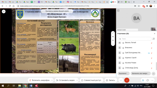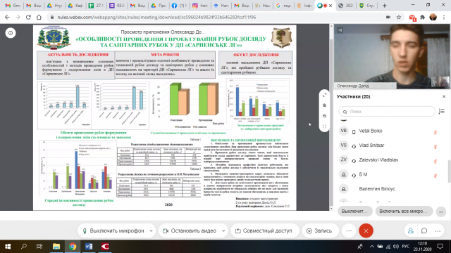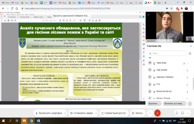 Незважаючи на пандемію через COVID-19, навчальний рік у магістрів 2 року навчання ННІ лісового і садово-паркового господарства успішно виходить на фінішну пряму. Черговим етапом їхньої підготовки стала постерна онлайн-презентація основних результатів досліджень, отриманих під час підготовки магістерських робіт. Розпочалася конференція з вітального слова директора ННІ Петра Лакиди, який побажав усім учасникам міцного здоров’я і наснаги, щоб успішно представили свої постери і якомога краще підготувалися до захисту випускних робіт. Заступники директора та завідувачі кафедр, користуючись нагодою, що онлайн зібралися всі магістри, оперативно вирішили всі організаційні питання щодо проведення постерної конференції, захистів звітів з виробничої практики і майбутніх захистів та випусків.