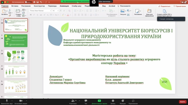 22 листопада 2021 року на кафедрі адміністративного менеджменту та зовнішньоекономічної діяльності відбулась постерна презентація результатів досліджень здобувачів другого (магістерського) рівня вищої освіти освітньо-професійної програми «Менеджмент зовнішньоекономічної діяльності» спеціальності 073 «Менеджмент» денної форми навчання в онлайн форматі з використанням платформи Zoom.