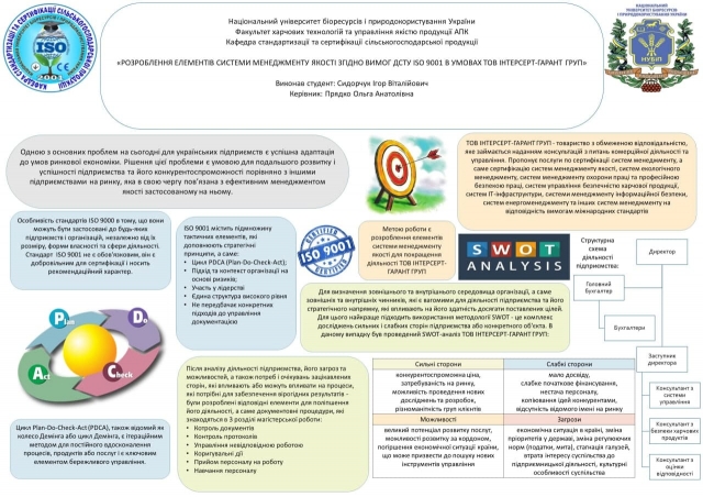 Розроблення елементів системи менедженту якості згідно вимог ДСТУ ISO 9001 в умовах ТОВ «ІНТЕРСЕРТ-ГАРАНТ ГРУП», м. Київ (Сидорчук І.В.);