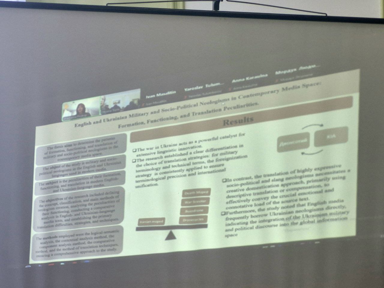 Магістранти не лише демонстрували результати своїх здобутків, а й професійно і переконливо їх обґрунтовували. Теми неординарного й інноваційного характеру охоплювали широке коло питань, приміром: стандарти перекладацьких послуг і постредагування машинного перекладу у міжнародному і національному вимірах; використання технологій штучного інтелекту в професійній підготовці філологів-перекладачів; особливості машинного перекладу наукових статей; засоби відтворення інтертекстуальності в українських перекладах; засоби відтворення облігаторності в англійській та українській мовах (на матеріалі політичних текстів).