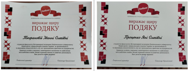 Свідченням цього стала відзнака керівництва одного із найбільших в Україні тваринницьких підприємств ТОВ «НВП «Глобинський свинокомплекс» роботи наших студентів-практикантів Іванни Тюфанової та Яни Проценко.