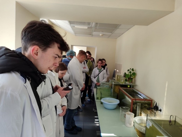 Завідувач науково-дослідного відділу еколого-токсикологічних досліджень, д.б.н., професор Світлана Хижняк ознайомила майбутніх агрономів із сучасними методами біотестування, що передбачають залучення тест-об’єктів різних трофічних рівнів. Студенти відвідали лабораторії, де культивуються наступні біотести: ● дафнії (Daphnia magna Straus.), церіодафнії (Ceriodaphnia affinis Lilljeborg), риби (гупії), водорості (Desmodesmus subspicatus); ● ґрунтові черви (Eisenia foetida), мікроорганізми; ● медоносні бджоли (Apis mellifera); Також Світлана Володимирівна ознайомила з методами фітотестування для аналізу рослин та насіння на наявність забруднювачів.