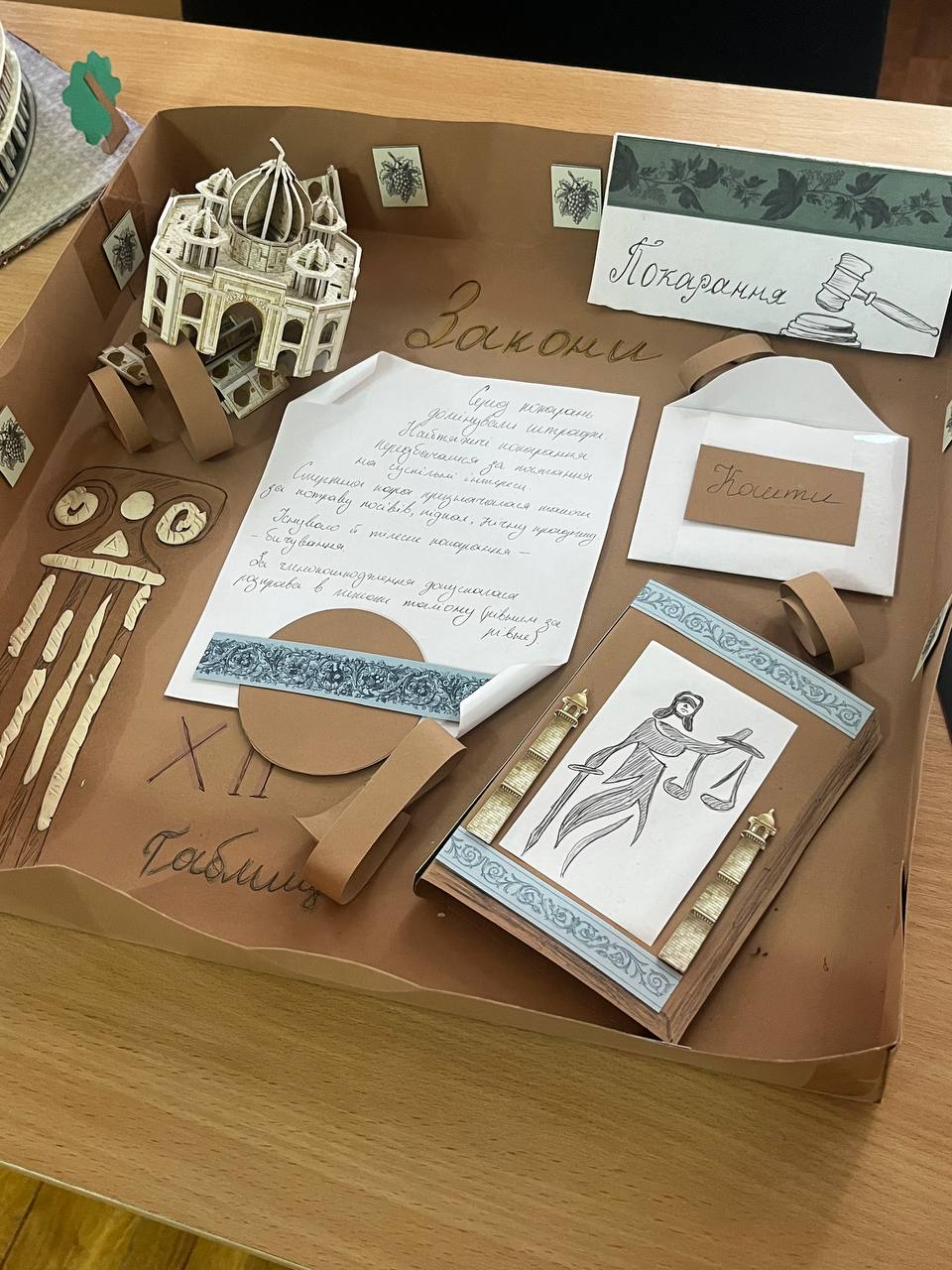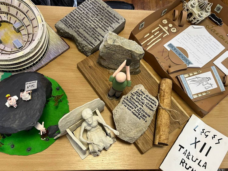 Аудиторія цього дня перетворилася на справжню залу римського форуму. Тут можна було побачити все — від дерев’яних табличок із відтвореними фрагментами законів і макетів давньоримських судів до яскравих малюнків, гіпсової ліпки та навіть символічних реконструкцій стародавніх обрядів. Кожен проєкт був унікальним, сповненим натхнення й любові до науки.