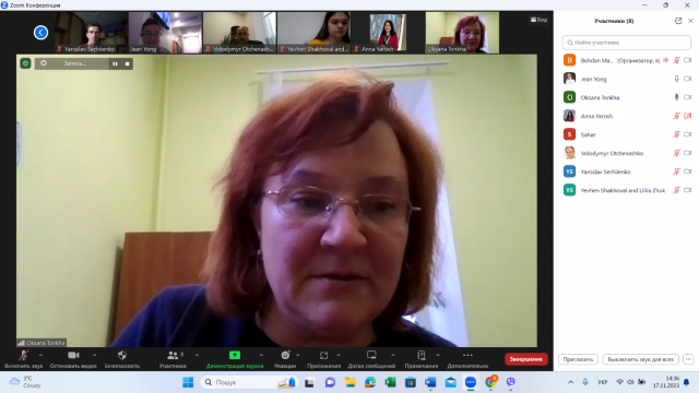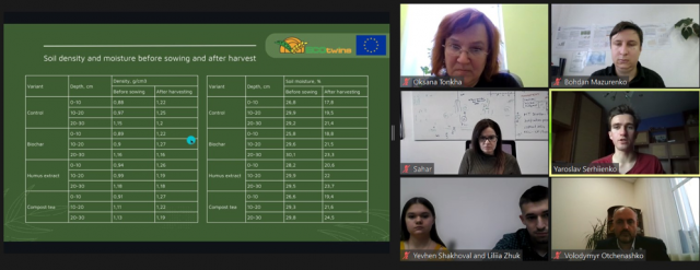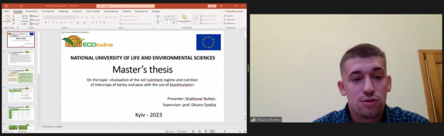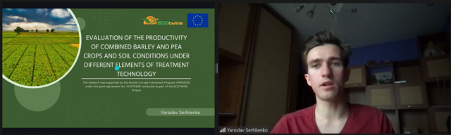Представлення результатів досліджень магістрами+учасниками проєкту ECOTWINS В рамках проєкту ECOTWINS 17 листопада 2023 відбулися передзахисти магістерських кваліфікаційних робіт, що містили дані, отримані в польовому досліді 2023 року. Заслуховували три доповіді на англійській мові від студентів, що брали безпосередню участь у виконанні проєкту. Головна мета проєкту – підвищити кваліфікацію науковців з НУБіП для покращення конкурентоспроможності в Європейському дослідному просторі. Підготовка магістрів, їх академічна мобільність та всебічний розвиток при підготовці кваліфікаційної роботи є тими складовими, що дозволяють поповнювати наукові кадри «молодою кров’ю», тому заслуховування результатів цієї підготовки є важливим кроком перед наступною планкою – захистом дипломних робіт. Оксана Тонха – керівник проекту побажала успіхів магістрам та розпочала засідання за участю вчених із НУБіП та країн учасників проєкту. Окрім магістрів – учасників проєкту та їх наукових керівників основні результати заслухали та обговорили Jean Yong (SLU, Швеція) та Sahar Azarkamand (ESCI, Іспанія). Перша доповідь Ярослава Сергієнка за темою: Evaluation of the productivity of combined barley and pea crops and soil conditions under different elements of treatment technology (Оцінка продуктивності сумісних посівів ячменю та гороху і ґрунтових умов за застосування різних елементів технологій вирощування) детально окреслила масштаб досліду та обсяг робіт, який виконала команда НУБіП під керівництвом Оксани Тонхи за цей рік. Оскільки кількість варіантів досліду становила 36, то в трикратній повторності слід було відбирати зразки з 108 ділянок, тому всі магістри взяли невеликий пласт для самостійного опрацювання.