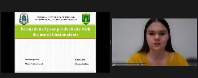 Лілія Жук виступила з наступною доповіддю: Formation of pea productivity with the use of biostimulants (Формування продуктивності гороху за застосування біостимуляторів), що фокусувалася вже на монопосівах гороху. Окрім виконання досліджень в Україні, Лілія відвідувала полігон в Данії, та виконувала частину своїх досліджень у Університеті Копенгагена під керівництвом Bhim Bahadur Ghaley. Магістерська робота фокусувалася на зміні показників доступних елементів живлення в грунті в ході вегетації гороху та внесенні біостимулянтів. Оскільки рослина в ході своєї вегетації споживає доступні форми азоту, фосфору та калію, то закономірним є їх зменшення. З іншої сторони грунт є живим середовищем, а недоступні форми можуть переходити в доступні внаслідок діяльності мікробіоти грунту, яка розвивається в ризосфері культурних рослин.