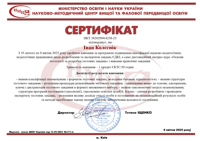 У межах програми підвищення кваліфікації науково-педагогічних працівників успішно завершено дистанційне навчання за експрес-курсом «Основи тестології та розробки тестових завдань». Цей курс став важливим кроком у напрямку вдосконалення знань і навичок з розроблення та експертизи завдань єдиного державного кваліфікаційного іспиту (ЄДКІ).
