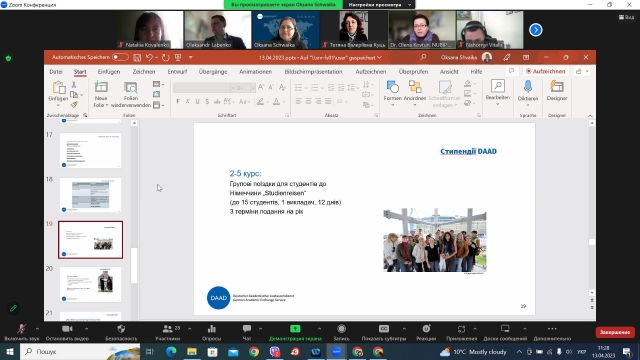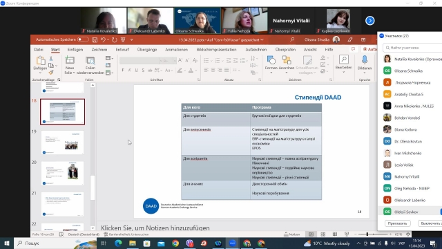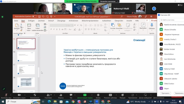 13 квітня відбулася онлайн зустріч студентів, аспірантів та викладачів НУБіП України з пані доктором Оксаною Швайкою з Національного академічного контактного центру (DAAD) для України. Пані Оксана представила всі наявні можливості для навчання та досліджень в Німеччині для українських студентів та науковців, що фінансуються програмами DAAD.