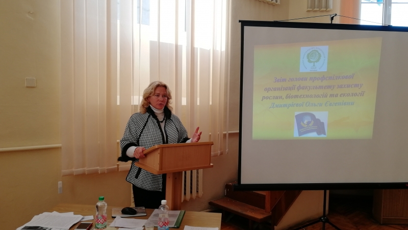 Звіт голови профбюро О. Дмитрієвої факультету захисту рослин, біотехнологій та екології, був схвалений. Доповідач відповіла на питання, що стосувались умов роботи в осінньо-зимовий період (низьких температур в корпусах, відсутність гарячої, а іноді і холодної води в корпусі №4; відсутності спортивної форми у команди викладачів факультету із футболу; якості літнього відпочинку співробітників; поліпшення житлових умов співробітників факультету; пільгового кредитування для придбання житла для молодих спеціалістів; обладнання приміщення на факультеті для збереження прекурсорів тощо. Виступаючі відмітили як ділові, так і морально-етичні якості голови профспілкової організації факультету, а саме – відповідальність, комунікабельність, увагу до співробітників, тактовність, толерантність, активність.