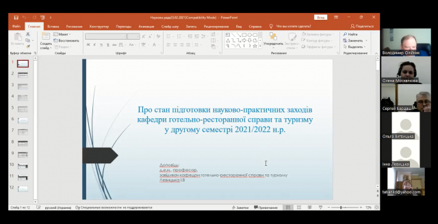 Про стан підготовки науково-практичних заходів кафедр ННІ неперервної освіти і туризму у другому семестрі 2021/2022 н.р. доповіли зав. кафедри готельно-ресторанної справи та туризму, д.е.н., проф. Левицька І.В. та зав. кафедри публічного управління, менеджменту інноваційної діяльності та дорадництва, д.н. з держ. управ., доц. Приліпко С.М. Звітували за розділами: