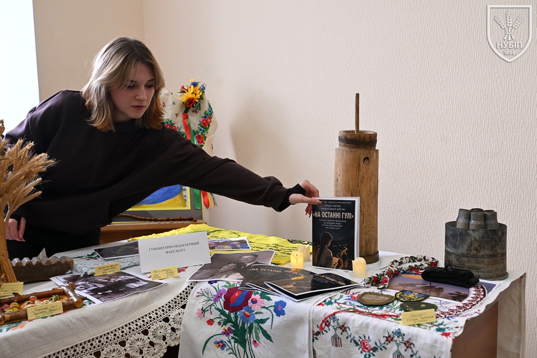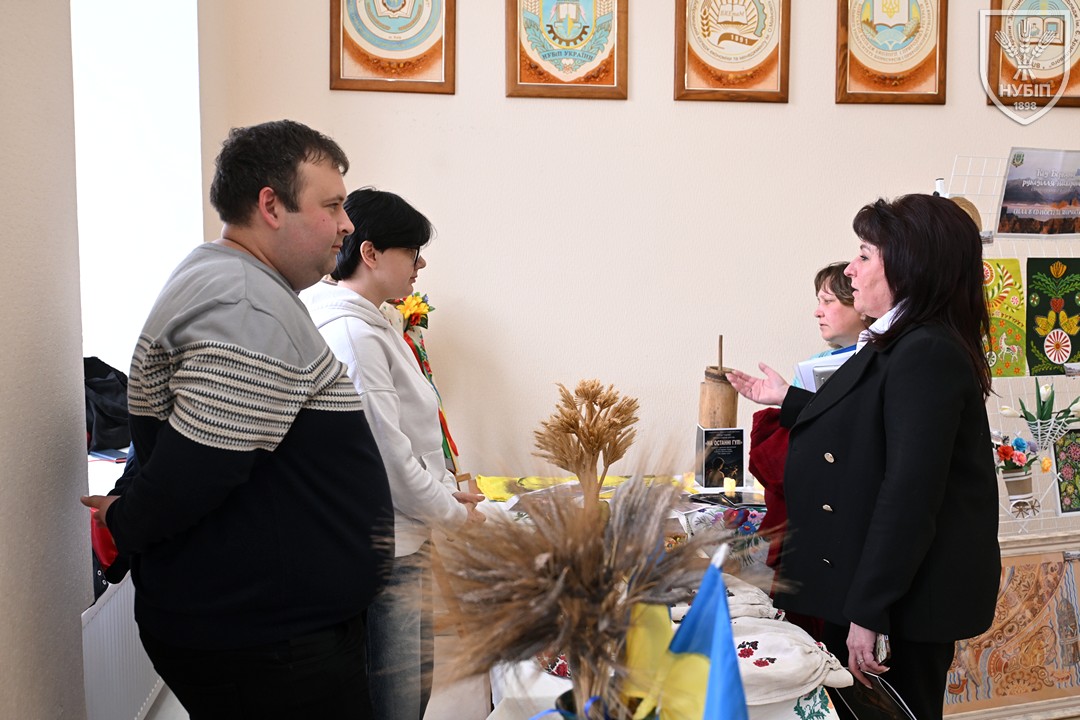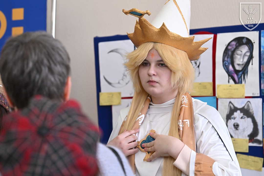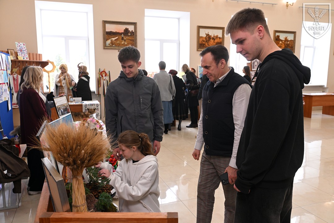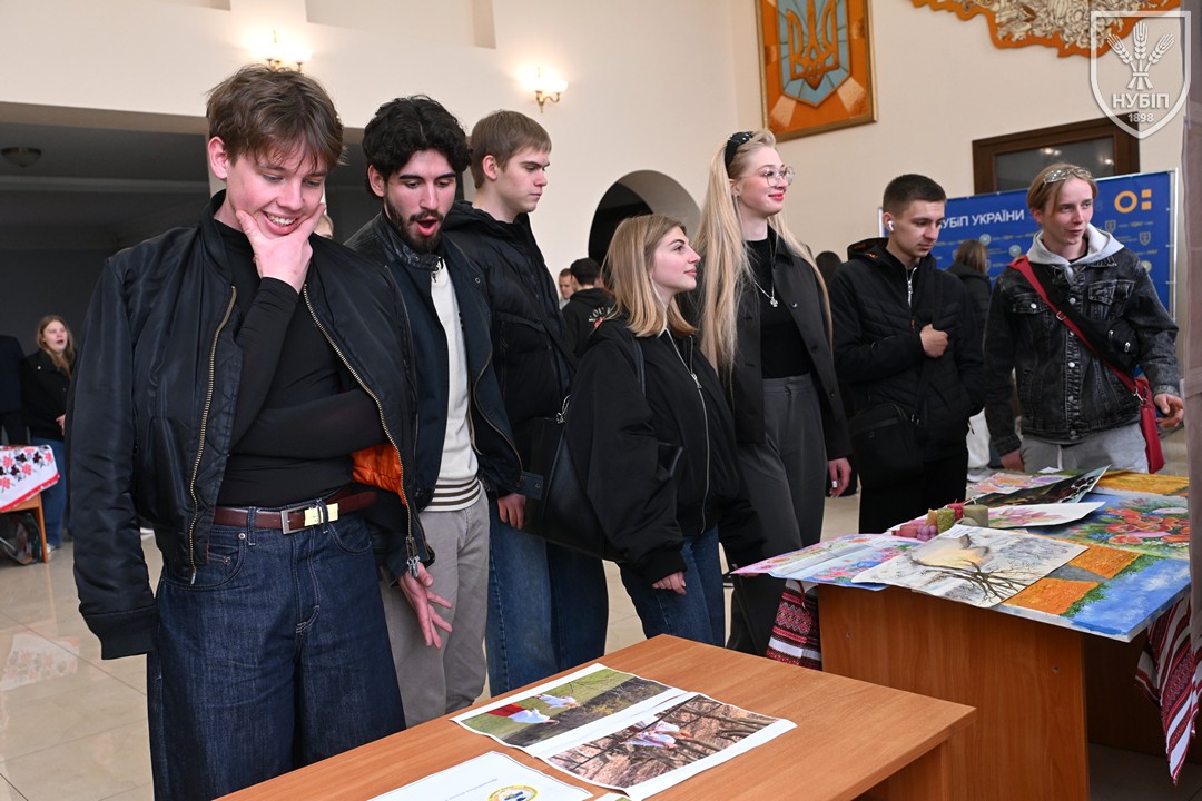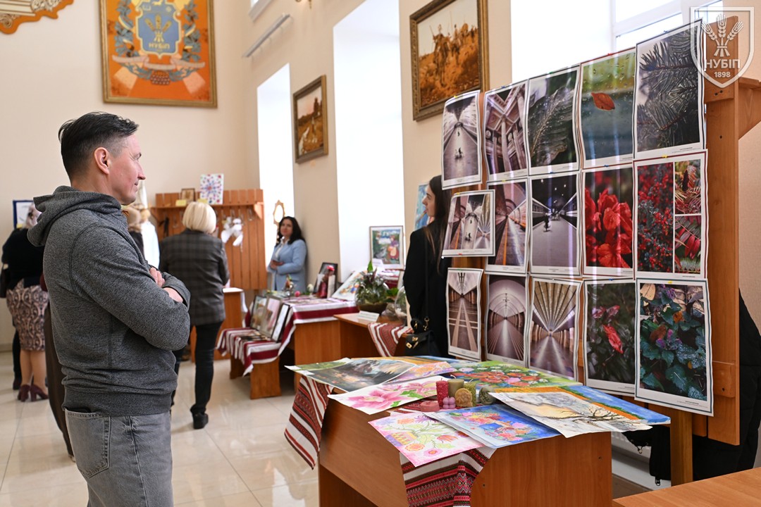 До початку перегляду конкурсних програм на сцені, які цьогоріч проходять під гаслом «Натхненні класикою — загартовані війною», Гербова зала університету стала місцем виставки творчих робіт студентів та викладачів університету у царині образотворчого, декоративно-вжиткового мистецтва (фотографії, живопису, графіки, декоративного розпису, оригамі, квілінгу, аплікації, колажу, вишивки, лозоплетіння і т.ін). Вражало розмаїття технік, стилів, форм, палітри того, що можна було побачити, але ж і представлення експозицій було надзвичайно колоритним, що відразу відзначили членкині образотворчого журі Олеся ВАРКАЧ (художник-графік, ілюстратор книг, членкиня Національної спілки художників України), Галина ЗАБАШТА (доценка кафедри мистецтва текстилю, вишивки та костюма Київської державної академії декоративно-прикладного мистецтва і дизайну імені Михайла Бойчука, членкиня Національної спілки художників України, лавреатка премії імені Катерини Білокур, заслужений діяч мистецтв України), Наталя ДЯЧЕНКО-ЗАБАШТА (старший викладач кафедри мистецтва текстилю, вишивки та костюма, спеціалізації «Арткостюм» Київської державної академії декоративно-прикладного мистецтва і дизайну імені Михайла Бойчука, членкиня Національної спілки художників України). «Приведемо сюди своїх студентів, — казали мисткині, — нехай подивляться, що таке справжній, а не формальний дух української творчості!»