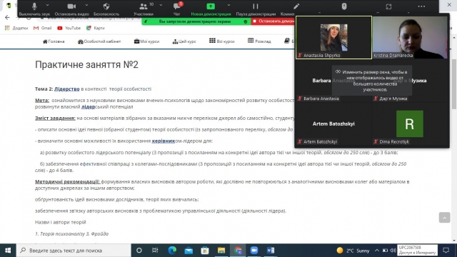 Відповідно до розкладу 2-го семестру 2021-2022 н.р. для здобувачів вищої освіти, 14 березня 2022 року надругій парі старший викладач кафедри менеджменту ім. проф. Й. С. Завадського Кристина Драмарецька провела практичне заняття на онлайн-платформі Zoom для студентів 4 курсу 3 групи факультету аграрного менеджменту з дисципліни «Теорія лідерства». Варто зазначити, що в сучасних умовах до заняття приєдналися 10 студентів, які активно долучились до виконання завдання.