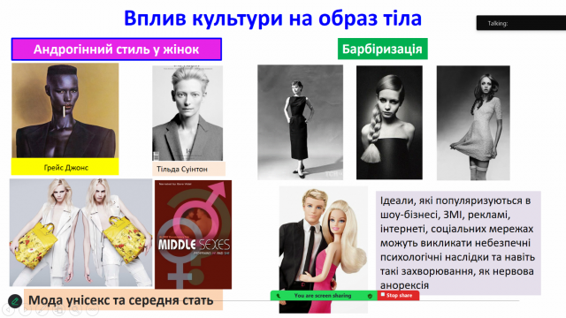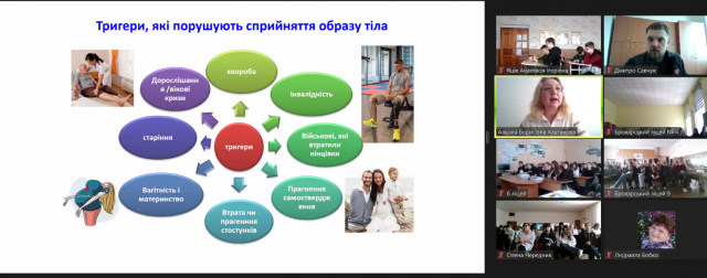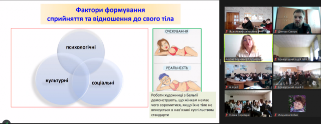 Альона Альтанова розповіла учням про тригери, які порушують сприйняття образу тіла; наскільки сильно впливають на нього культурні ідеали різних епох, релігія, установки, які популяризуються в шоу-бізнесі, ЗМІ, рекламі, інтернеті, соціальних мережах, і найголовніше – чому підлітки є такими чутливими до цих зовнішніх впливів, і як важливо «включати» критичне мислення, аби бути впевненим у собі та запобігти небезпечним психологічним наслідкам та таким захворювання, як розлади харчової поведінки.