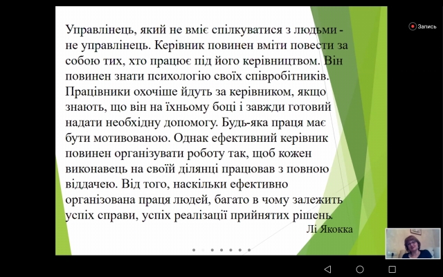 В кінці лекції було підкреслено, що будь-яка компанія, фірма, підприємство функціонують успішно, коли управління здійснюється професійно, і процитовано Лі Яккоку, який вважав, що суть успішного управління полягає в налаштуванні людей на працю та в умінні спілкуватися з людьми.