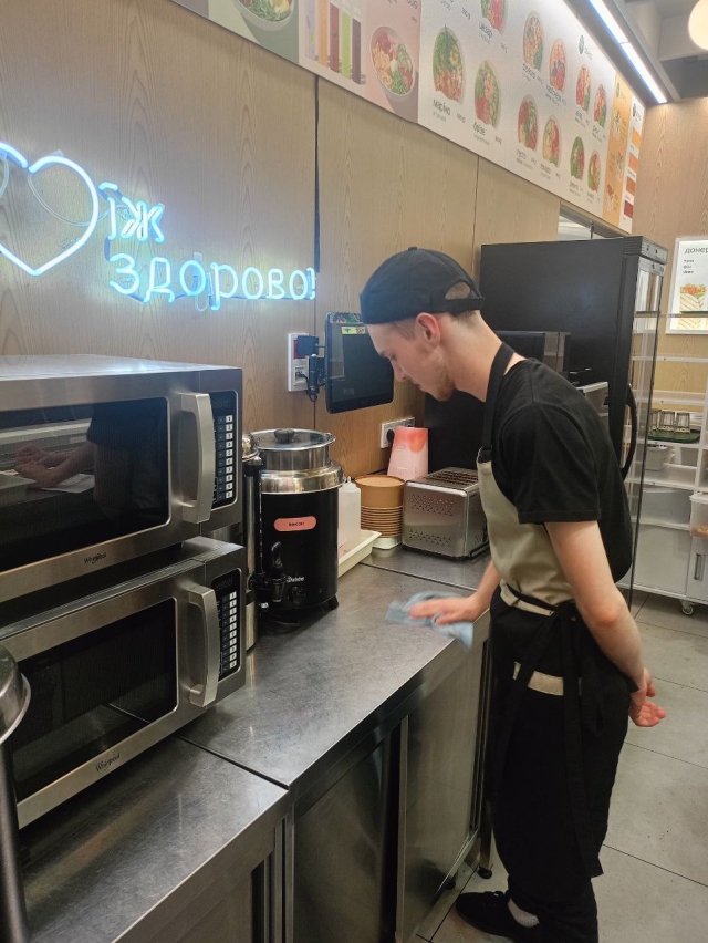Під час години пік я працював на лінії салатів — збирав салати або пасту за індивідуальними побажаннями клієнтів. Це навчило мене працювати швидко, точно та зосереджено.