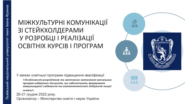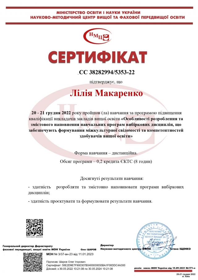 20 – 21 грудня 2022 року НАУКОВО-МЕТОДИЧНИЙ ЦЕНТР ВИЩОЇ ТА ФАХОВОЇ ПЕРЕДВИЩОЇ ОСВІТИ проводив навчання на тему: «Особливості розроблення та змістового наповнення навчальних програм вибіркових дисциплін, що забезпечують формування міжкультурної свідомості та компетентностей здобувачів вищої освіти». Обсяг програми – 8 годин (0,2 кредити ЄКТС). Детальніше.