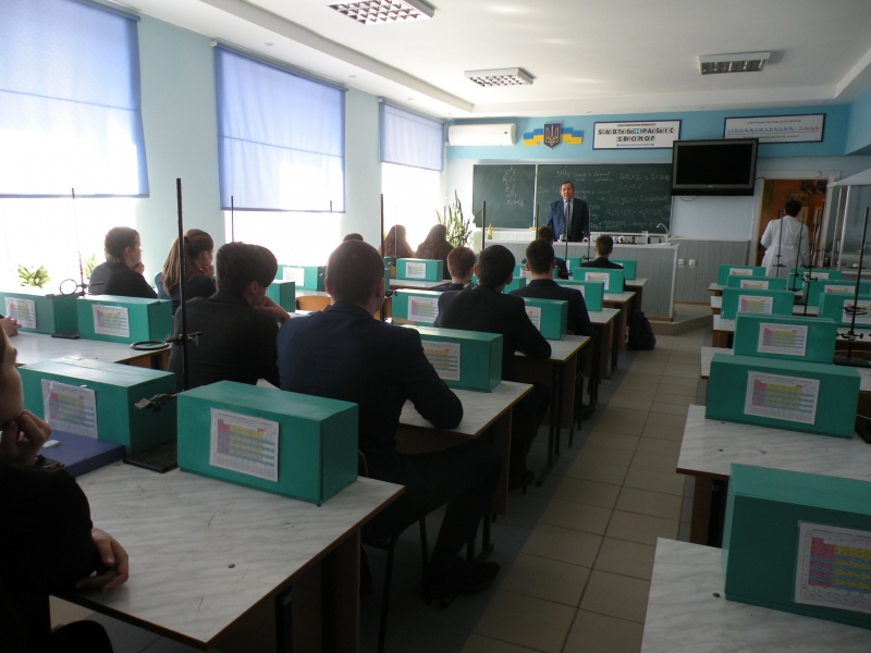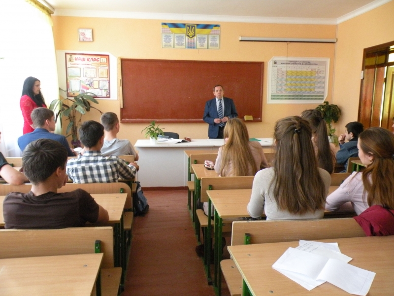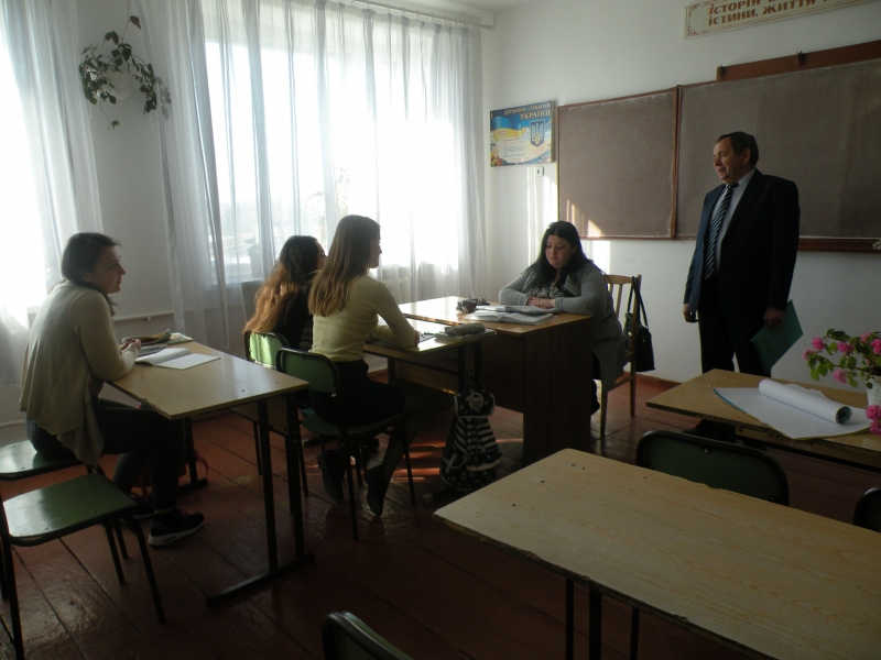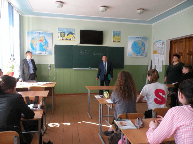 Професор Костюк В.К. знайомить учнів випускного класу Володимирецької загальноосвітньої школи І-ІІІ ступенів №1 з структурою НУБіП України, розповідає про різні спеціальності, якими вони можуть оволодіти у цьому відомому в Україні та за її межами університеті, відповідає на питання учнів та вчителів