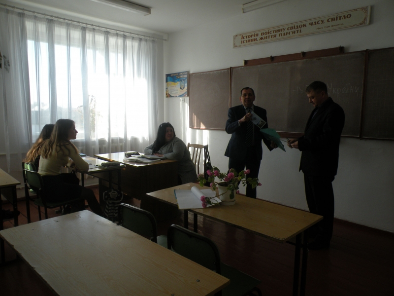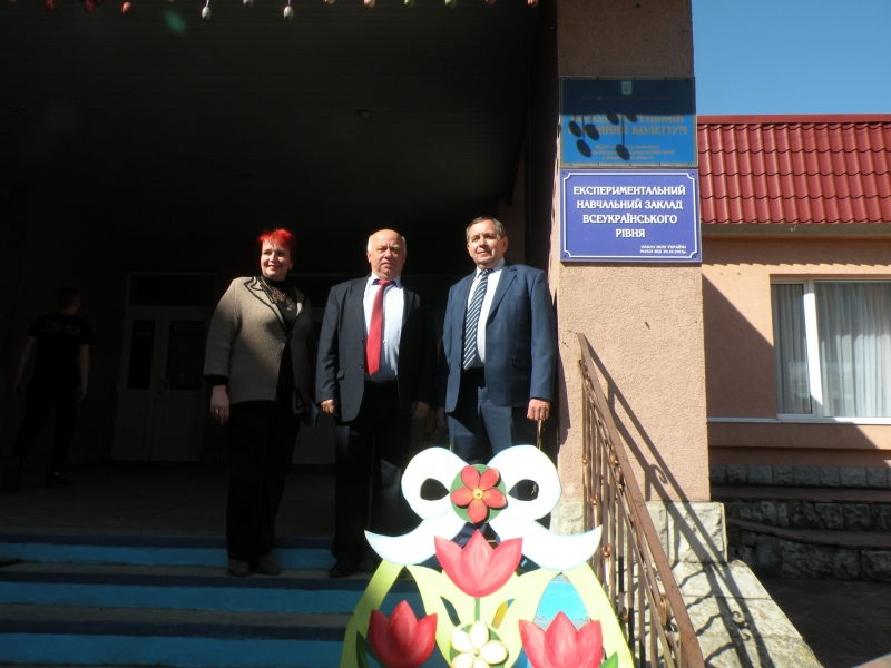 Після спілкування з учнями та вчителями фото з директором колегіуму Остапенком Анатолієм Федоровичем, заслуженим працівником освіти України, головою Асоціації керівників закладів освіти нового типу Рівненської області, членом координаційної ради Асоціації директорів шкіл України та заступником директора з науково-методичної роботи, спеціалістом вищої категорії, старшим вчителем Волчецькою Людмилою Анатоліївною