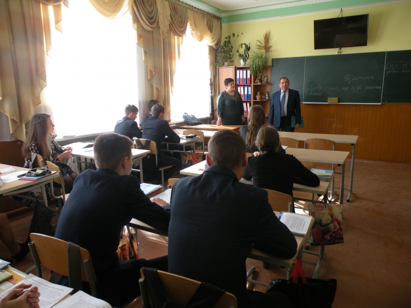 Професор Костюк В.К. на уроці алгебри випускного класу Красносільського навчально-виховного комплексу «Загальноосвітня школа І-ІІІ ступенів – дошкільний навчальний заклад» Володимирецького району Рівненської області знайомить випускників 2018 року з НУБіП України та передає директору школи, Мартинюку Василю Даниловичу буклети про університет та факультет ветеринарної медицини