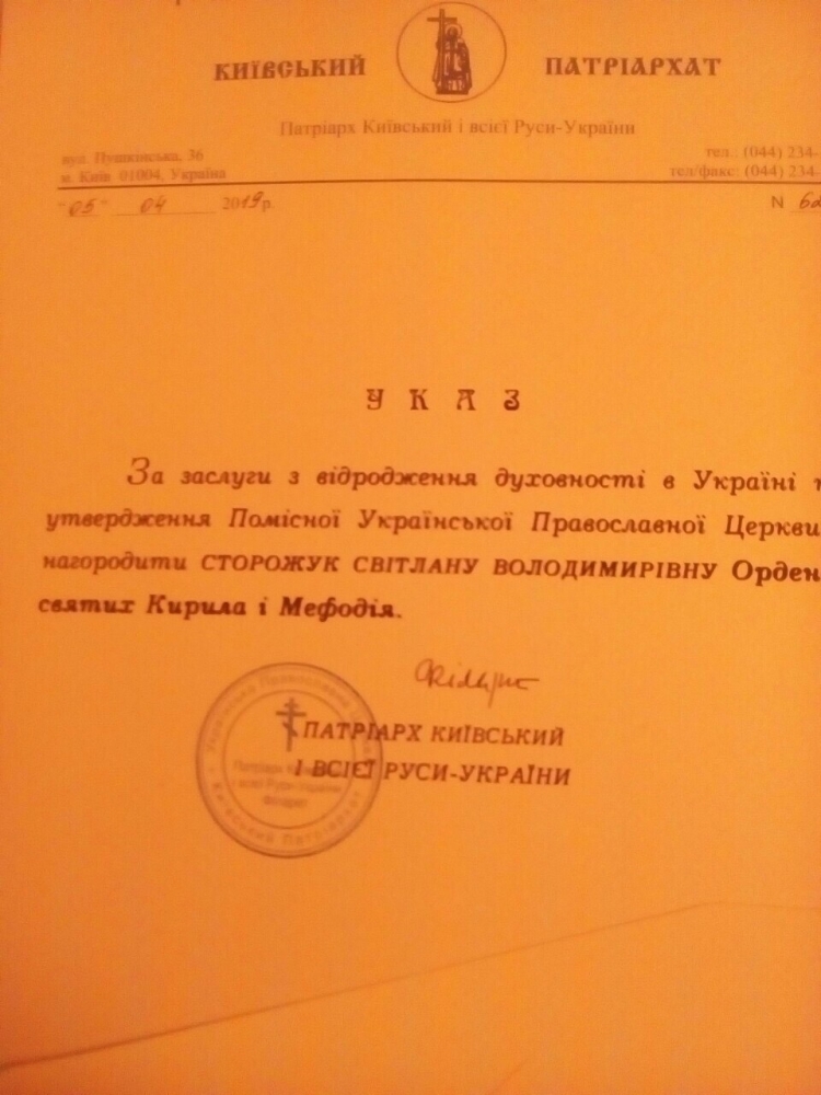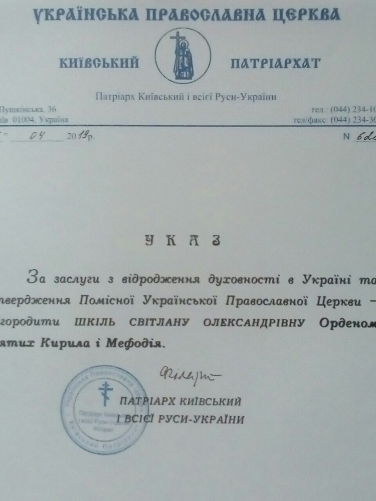 15 квітня 2019 року в Національному педагогічному університеті імені М.П. Драгоманова відбулася Всеукраїнська конференція на тему: «Унезалежнення православних та його вплив на релігійно-церковне і суспільно-політичне життя сучасної України». На конференції відбулося експертне обговорення стану та перспектив українського православ’я. У обговоренні взяли участь провідні вітчизняні релігієзнавці та богослови, представники єпископату і священства. Професор кафедри філософії НУБіП України Світлана Сторожук виступила з доповіддю «Релігійний елемент в сучасній українській національній ідентичності». Професор Світлана Шкіль доповідала на тему «Боротьба наративних стратегій в українському православному середовищі». Під час конференції за заслуги з відродження духовності в Україні та утвердження Помісної Української Православної Церкви професори Світлана Сторожук і Світлана Шкіль були нагороджені орденами святителів Кирила і Мефодія.