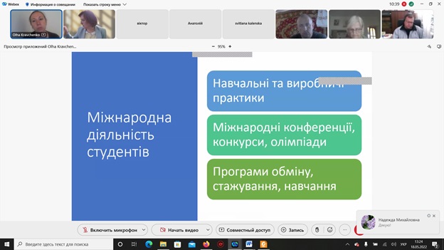 Також був заслуханий звіт відповідальної за міжнародну діяльність на факультеті доц. Ольга Кравченко. В своїй доповіді вона проінформувала присутніх про досягнення в міжнародній діяльності, зупинилася на міжнародних практиках студентів що відбувалися в Данії, Нідерландах, Франції, Німеччині. Відмітила участь у міжнародних конференціях, міжнародних конкурсах студентів факультету. Проаналізувала міжнародну діяльність викладачів, зупинилася на грантових програмах, міжнародних конференціях, публікаціях в міжнародних виданнях. Приділила увагу завданням, які сприятимуть покращенню міжнародної діяльності, наголосила на важливості отримання інформації студентів та викладачів, щодо можливостей розширення міжнародної співпраці.