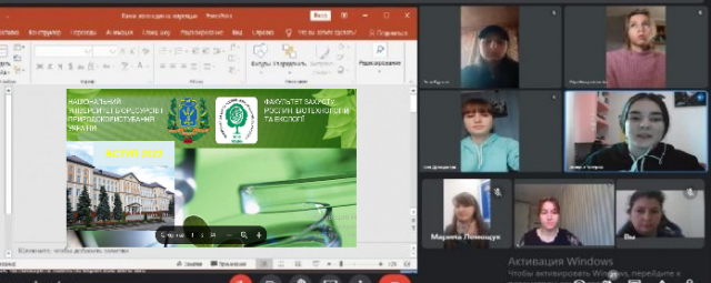 30 квітня 2024 року доцентом кафедри фізіології, біохімії рослин та біоенергетики Наталією НЕСТЕРОВОЮ було проведено профорієнтаційний он-лайн-захід для учнів 11 класів Лохвицької загальноосвітньої школи І-ІІІ ступенів №2 (м. Лохвиця, Полтавської області). Учнів зібралося небагато, оскільки зустріч відбулась он-лайн в учбовий день, проте розгорнулась жвава дискусія. Школярі були дуже зацікавлені в інформації про факультет захисту рослин, біотехнологій та екології та його спеціальності, задавали багато запитань: по-перше, цікавились умовами проживання в гуртожитку та наявністю безпечного укриття, чи є можливість стажування за кордоном та отримання подвійного диплому, а по-друге, який відсоток випускників працевлаштовується за фахом.