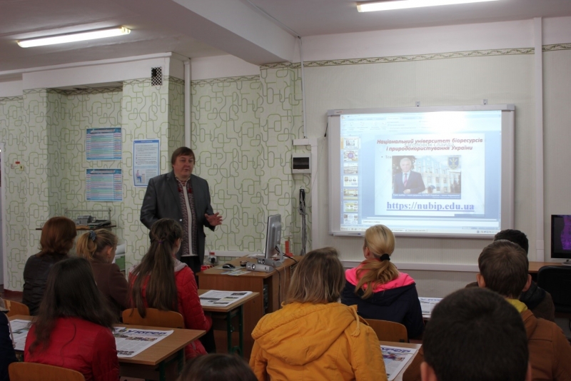 Перед початком зустрічі учням та вчителям було роздано інформаційні матеріали про факультет та університет, а на дошці оголошення школи розміщено інформацію про підготовчі курси у НУБіП України.