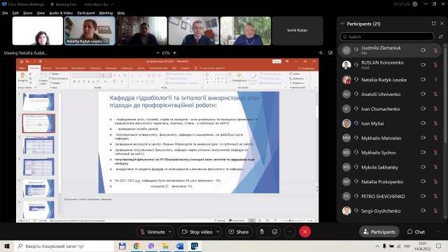 Першим питанням порядку денного вченої ради став звіт про підходи до профорієнтаційної роботи на кафедрах: аквакультури; біології тварин; генетики, розведення та біотехнології тварин; гідробіології та іхтіології. Завідувачі кафедр, професори Віталій Бех, Сергій Рубан, Микола Сахацький та доцент Наталія Рудик-Леуська доповіли про проведену роботу. Декан факультету звернув увагу членів вченої ради на те, що працівникам факультету необхідно зосередити увагу саме на проведенні профорієнтаційної роботи серед школярів, випускників коледжів та технікумів та інших навчальних закладів.