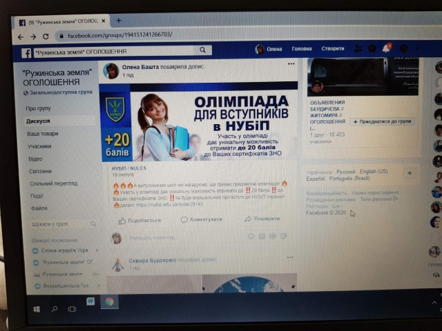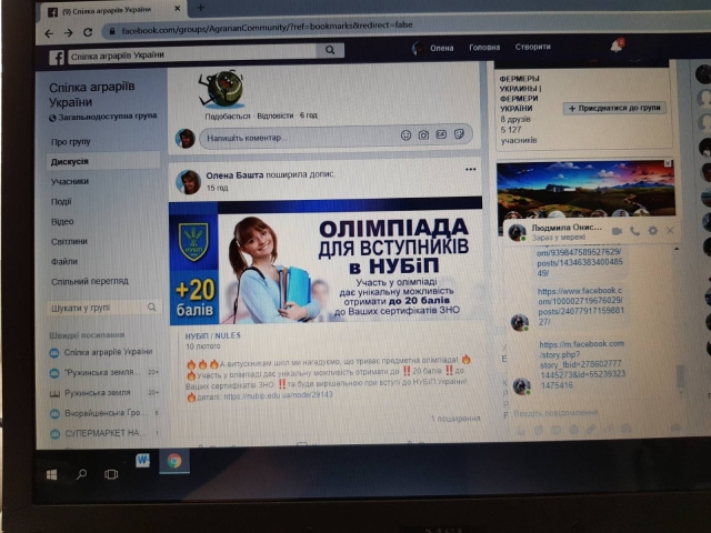 Так, доцент кафедри Башта Олена Валентинівна поширила у групах ФБ «Спілка аграріїв України» та «Ружинська земля» «ОГОЛОШЕННЯ» оголошення про проведення Олімпіади для вступників у НУБіП України.