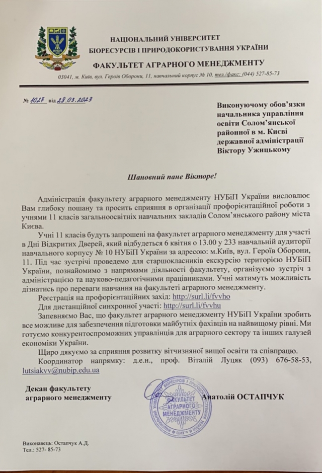 В межах підготовки до Дня Відкритих Дверей Національного університету біоресурсів і природокористування України (6 квітня 2023 р.) представники факультету аграрного менеджменту провели ряд зустрічей в Солом’янському районі м. Київ.