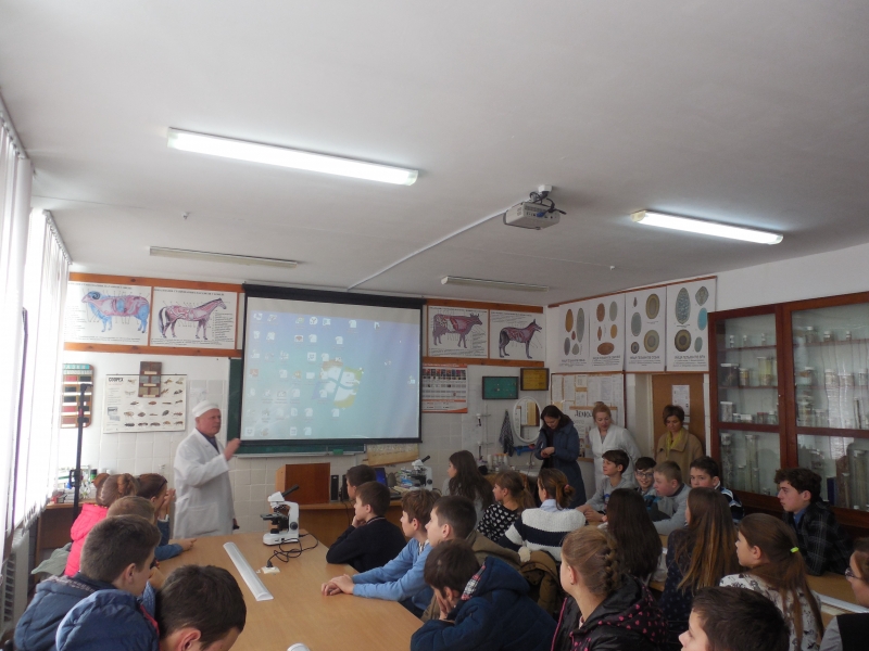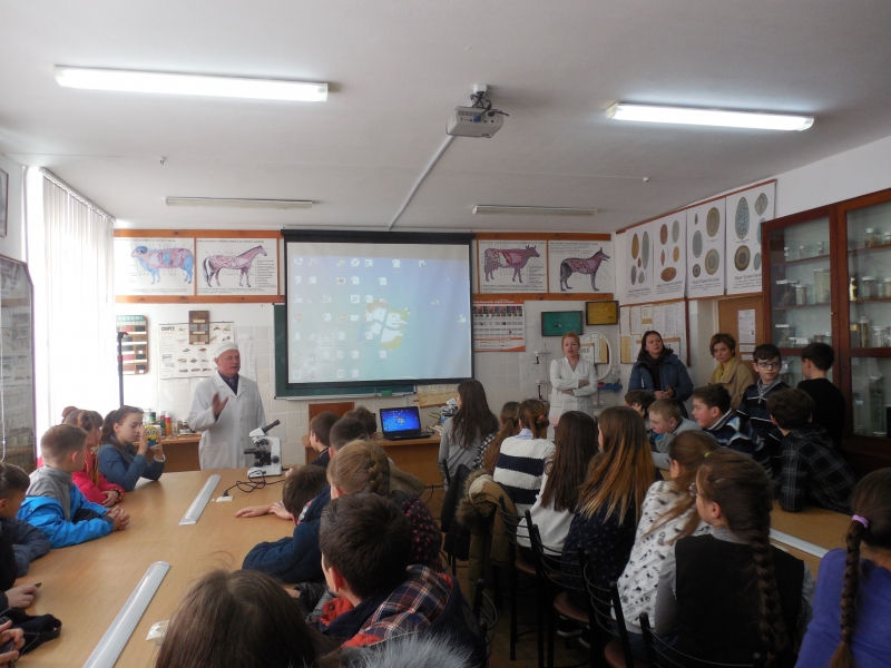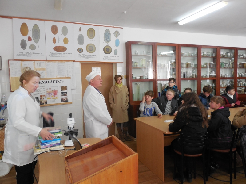 Зустрів школярів професор кафедри, доктор ветеринарних наук Прус М.П. У своїй короткій презентації він зупинився на характеристиці тих паразитів, що викликають захворювання у дрібних домашніх тварин, які мешкають у міських квартирах поряд із людьми. До того ж на запитання у кого вдома живуть домашні тварини, руки підняли усі присутні. Михайло Петрович продемонстрував макропрепарати паразитичних організмів, а тих, що не видно неозброєним оком, можна було уважно розгледіти під мікроскопами. З особливою увагою і зацікавленістю учні переглянули деякі відеоматеріали, які були продемонстровані з використанням мультимедійного проектора. А потім посипались запитання, які уважно вислуховував наш поважний професор і давав зрозумілі дітям і вичерпні відповіді.