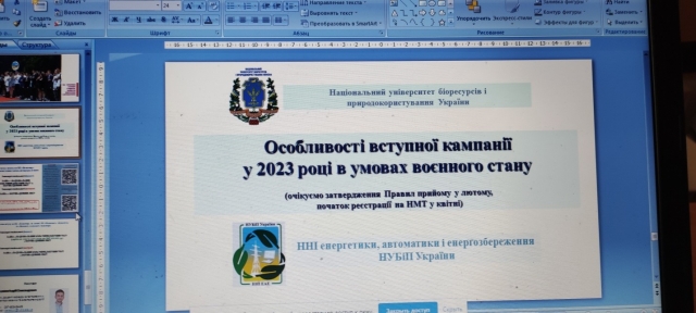 У вигляді презентації та цікавої розповіді студентам була представлена інформація в розрізі спеціальностей 141 – електроенергетика, електротехніка та електромеханіка та 144 – Теплоенергетика. В процесі розповіді у студентів викликала зацікавленість прохідного балу, шансів навчатися за бюджетною формою навчання та можливості отримання додаткових балів після консультаційно-підготовчих курсів, які проводяться на базі НУБіП України з огляду на попередню вступну компанію.
