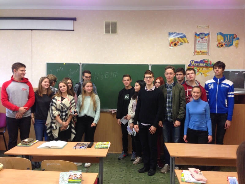 За дорученням старшого викладача кафедри англійської філології Шанаєвої-Цимбал Л.О. 23 – 26 жовтня 2017 року відбулася зустріч студентів 1 курсу 3 групи факультету аграрного менеджменту (Гопка М., Ковальчук А., Король В., Петренко Л., Кудашева А., Романишин Т., Побочій М.) з випускниками загальноосвітніх шкіл № 179 та № 285 м. Києва. Під час зустрічі адміністрація, викладачі та учні зустріли студентів доброзичливо. Студенти провели бесіду з учнями 11 класів, під час якої розповіли про напрямки наукової та навчальної роботи на гуманітарно-педагогічному факультеті, про студентське життя, традиції і досягнення НУБіП України та про правила прийому абітурієнтів у 2018 році. Щоб підвищити наочність та зацікавити молодь спеціальностями факультету, студенти надали майбутнім абітурієнтам розроблені рекламні матеріали у вигляді буклетів та календариків. Учні зацікавились отриманою інформацією, оскільки такі подарунки покращують настрій абітурієнтів, надають можливість докладніше вивчити та обміркувати з батьками правила вступу до НУБіП України та стають незмінними помічниками в повсякденному шкільному житті.
