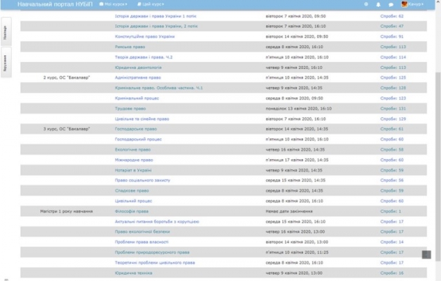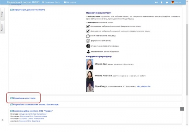 На сторінці юридичного факультету була створена рубрика «Проміжна атестація», де були розміщені тести для проходження атестації з усіх навчальних дисциплін, які забезпечують кафедри для студентів юридичного факультету денної форми навчання.