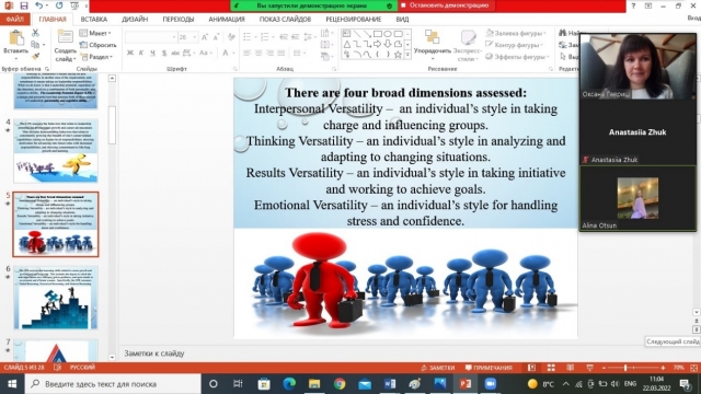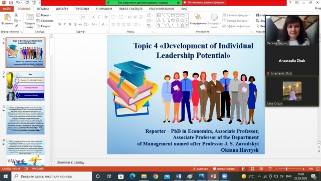 Так, доцентом кафедри менеджменту ім. проф. Й. С. Завадського Гавриш Оксаною Миколаївною 15 та 22 березня були проведені лекційні заняття для здобувачів 4 курсу факультету аграрного менеджменту з дисципліни «Leadership Theory», на яких розглянуто тему «Potential Development of Individual Leadership». 16 та 23 березня на практичних заняттях з даної дисципліни Оксана Гавриш провела тренінг, на якому студенти проявляли свій особистий лідерський потенціал, розглянули перспективи подальшого розвитку здобувачів вищої освіти та їхньої самоорганізації.