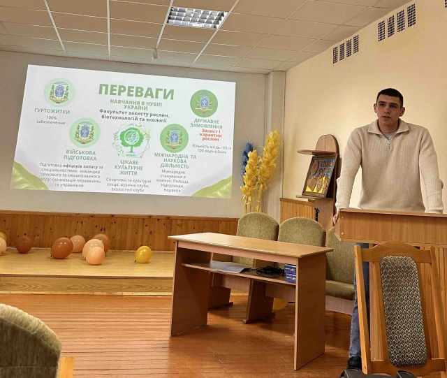 Владислав Павлюк, під час зустрічі, у цікавій формі розповів учням старших класів можливості реалізації власних амбіцій під час навчання на факультеті Захисту рослин, біотехнологій та екології.