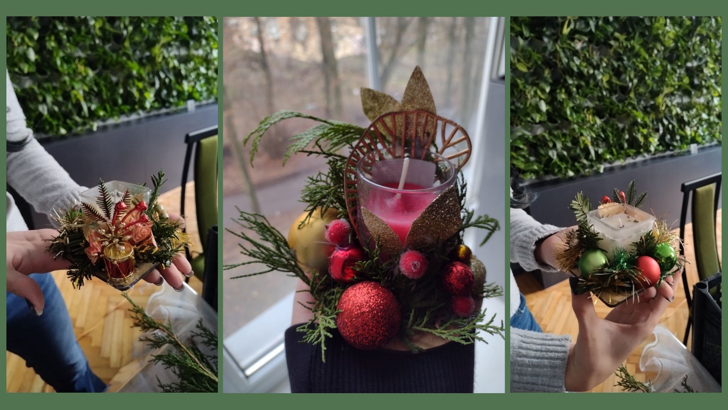 Тема майстер-класу була присвячена створенню різдвяних композицій зі свічкою — атмосферних декоративних виробів, що поєднують сучасні техніки та традиційні матеріали.
