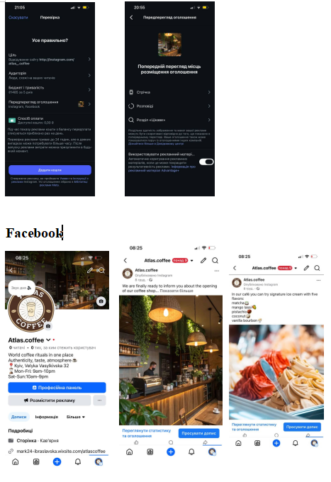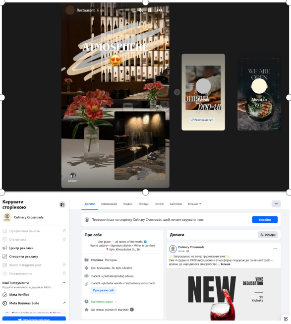 Наступним кроком була розробка повноцінного сайту на конструкторах Wix або Weblium, створення бізнес-сторінок у Facebook та Instagram, їх звязування та налаштування реклами через кнопку «Просувати» та через рекламний кабінет Ads Manager з детальним визанченням цільової аудиторії та підбором креативів і рекламних текстів. Також студенти спробували розібратися з роботою Google Ads та особливостями налаштування реклами.