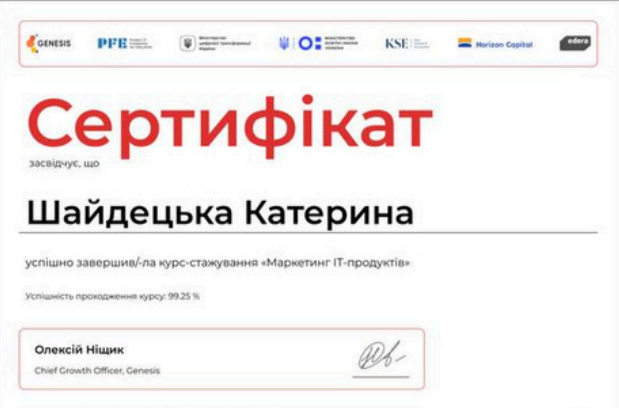 У ході виконання самостійної роботи з дисципліни студенти мали можливість долучитись до неформальної освіти з курсу та попрацювати на навчальній платформі Strum від компанії «Genesis» та отримати сертифікати про закінчення курсу «Маркетинг IT-продуктів».
