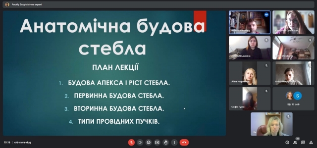 Лекція проходила онлайн, на платформі Google Meet, на другій парі (о 1010). На початку лектор чітко з’ясував тему лекції, її структуру та актуальність, а також зв’язок з попередніми темами й спорідненими дисциплінами. Викладання матеріалу було логічним та послідовним. Під час лекції Андрій Ігорович продемонстрував високий науковий рівень володіння матеріалом, педагогічну майстерність у доведенні на доступному для студентів рівні складних анатомічних особливостей різних варіантів організації апекса у судинних рослин та процесів диференціації меристем у постійні тканини, а також обізнаність з різноманітними технічними засобами унаочнення лекційного матеріалу.