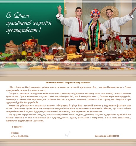 Привітання колективу факультету з Днем працівника харчової промисловості від Ректора Національного університету харчових технологій сб, 19 жов 2024 - 03:00